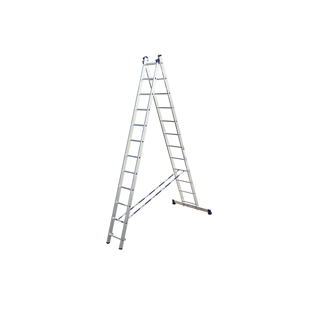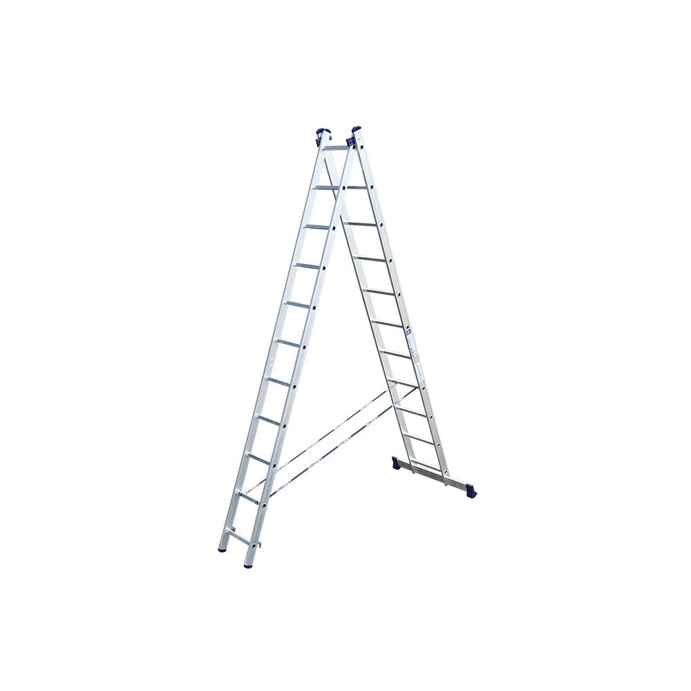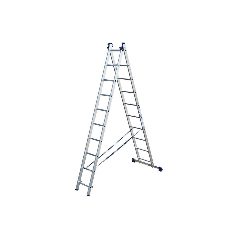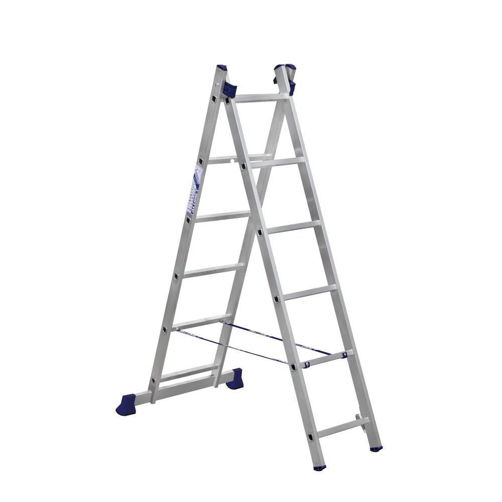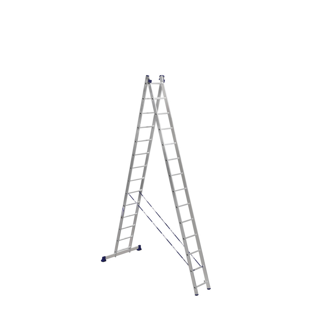 Универсальность лестницы заключается в том, что она может использоваться как раздвижная приставная лестница и как свободностоящая двухсторонняя стремянка.